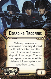 So the interesting thing with Boarding Troopers is they trigger upon revealing a command and you discard a squadron token or (worse plan) squadron dial and discard the card to trigger their effect. You could for example discard a squadron token to use them and then spend a squadron dial afterward to activate squadrons normally, because the Boarding Troopers are not part of a squadron command.